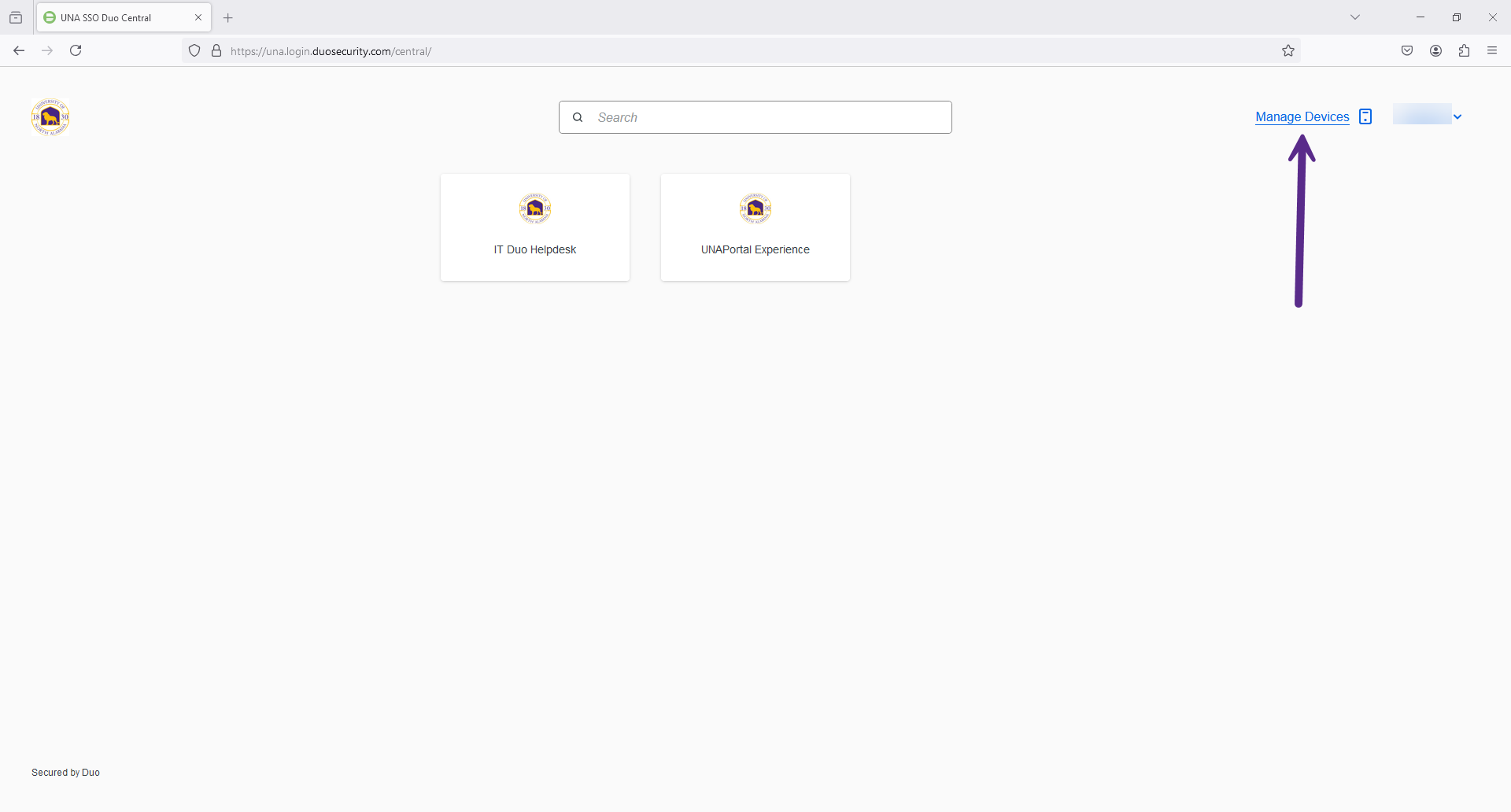 Visit una.login.duosecurity.com and log in with your UNAPortal username and password. Once logged in (you may need to accept a Duo push to your device), click on the Manage Devices link at the top-right of the page. You will be prompted to log in again with your UNA username and password. You will be prompted to verify your identity before managing your devices.