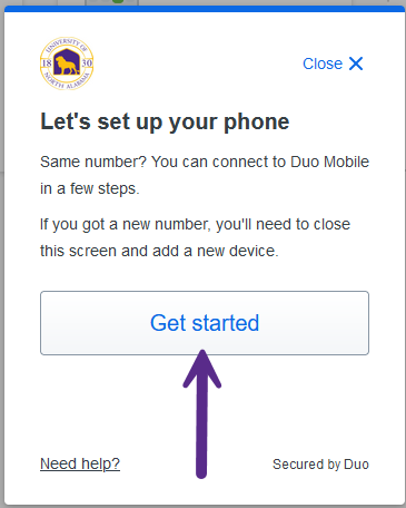 Click on the "I have a new phone" link for your current mobile phone. Click the "Get started" button on the next screen to connect your new phone to Duo Mobile. Please note that if you are adding another mobile phone number, you will need to click on the "Add a device" option on the previous screen.
